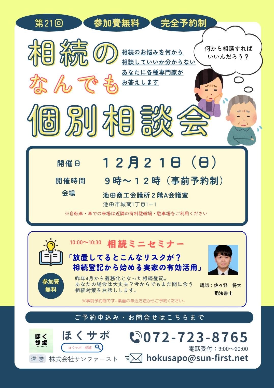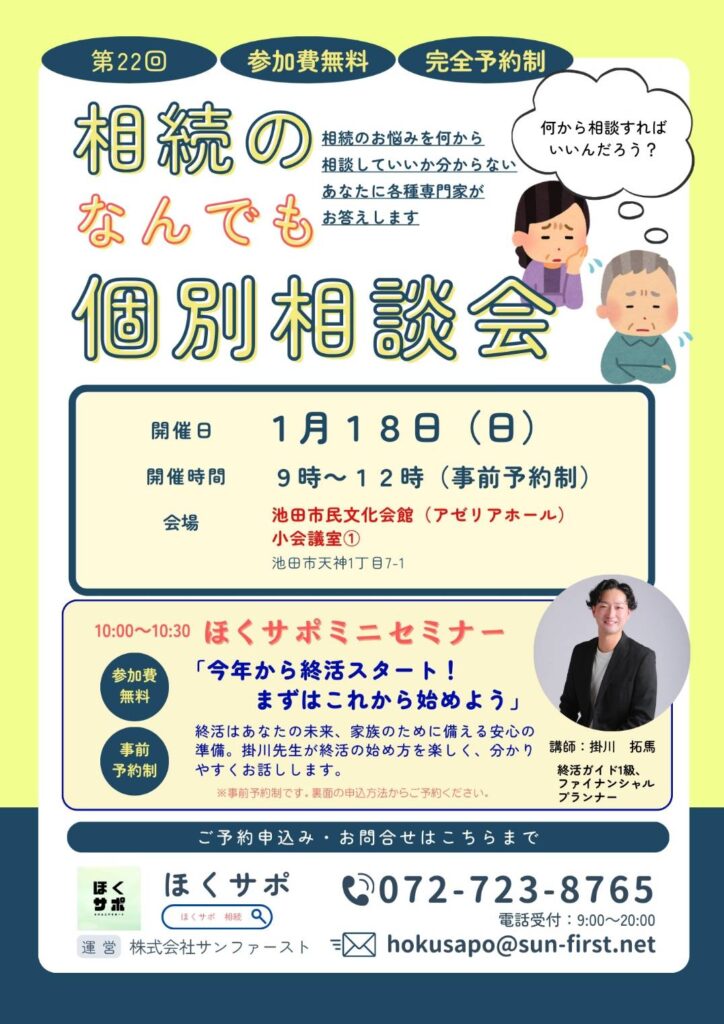 ほくサポが実施している個別相談会は無料で税理士、司法書士等の専門家に相談することができます。